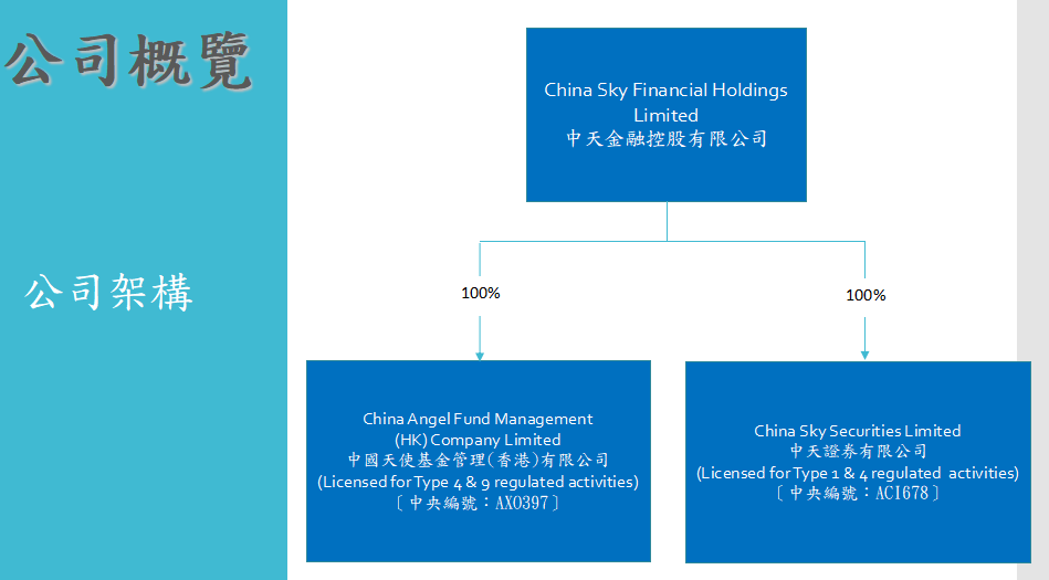 - 透過「中天證券有限公司」,可進行證券買賣、融資、包銷及配售等參與投資